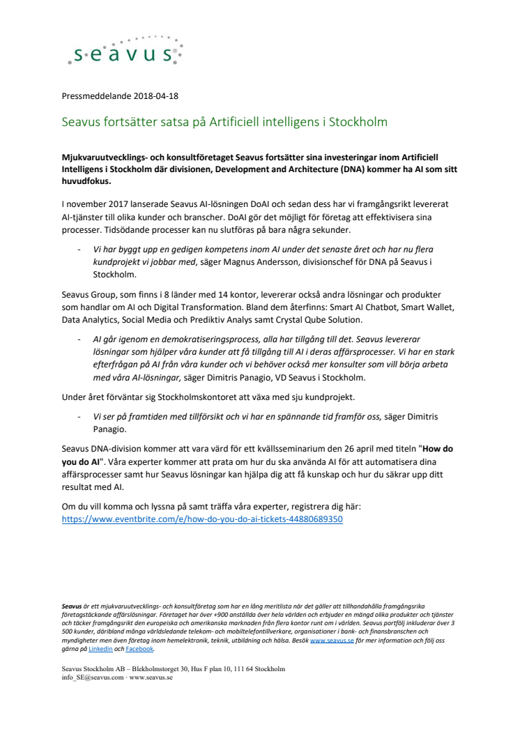 Seavus fortsätter satsa på Artificiell intelligens i Stockholm