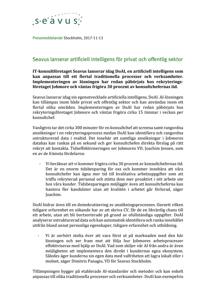 IT‐konsultföretaget Seavus lanserar idag DoAI, en artificiell intelligens som kan anpassas till ett flertal traditionella processer och verksamheter. Implementeringen av lösningen har redan påbörjats hos rekryteringsföretaget