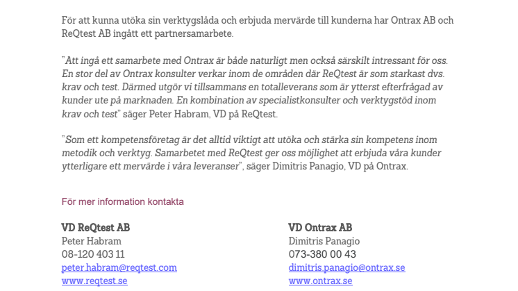 ”Att ingå ett samarbete med Ontrax är både naturligt men också särskilt intressant för oss. En stor del av Ontrax konsulter verkar inom de områden där ReQtest är som starkast dvs. krav och test. Därmed utgör vi tillsammans en totalleverans som är ytterst efterfrågad av kunder ute på marknaden. En kombination av specialistkonsulter och verktygstöd inom krav och test” säger Peter Habram, VD på ReQtest.