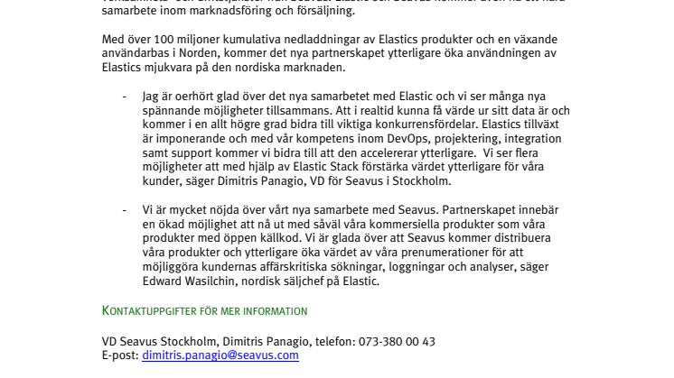 - Vi är mycket nöjda över vårt nya samarbete med Seavus. Partnerskapet innebär en ökad möjlighet att nå ut med såväl våra kommersiella produkter som våra produkter med öppen källkod. Vi är glada över att Seavus kommer distribuera våra produkter och ytterligare öka värdet av våra prenumerationer för att möjliggöra kundernas affärskritiska sökningar, loggningar och analyser, säger Edward Wasilchin, nordisk säljchef på Elastic.