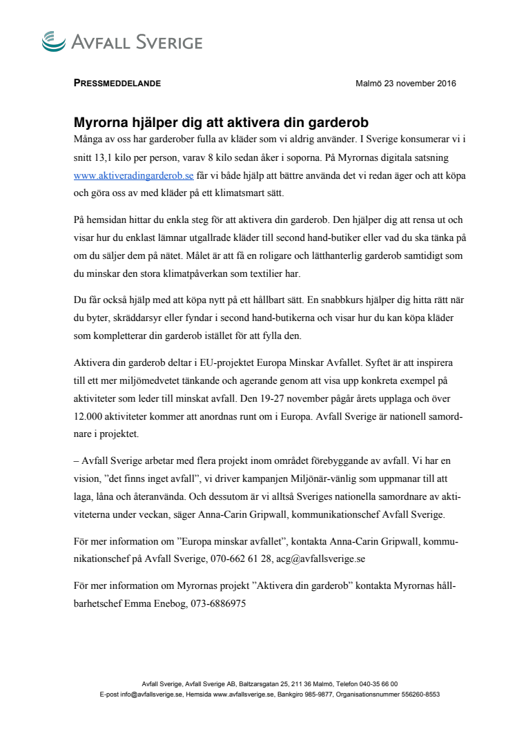 Många av oss har garderober fulla av kläder som vi aldrig använder. I Sverige konsumerar vi i snitt 13,1 kilo per person, varav 8 kilo sedan åker i soporna. På Myrornas webbsatsning www.aktiveradingarderob.se får vi både hjälp att bättre använda det vi redan äger, att köpa och att göra oss av med kläder på ett klimatsmart sätt. "Aktivera din garderob" deltar i projektet Europa Minskar Avfallet.