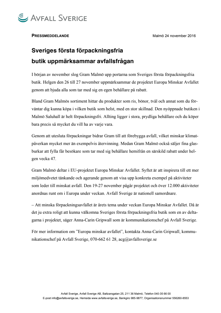 I början av november slog Gram Malmö upp portarna som Sveriges första förpackningsfria butik. Helgen den 26 till 27 november uppmärksammar de projektet Europa Minskar Avfallet genom att bjuda alla som tar med sig en egen behållare på rabatt.