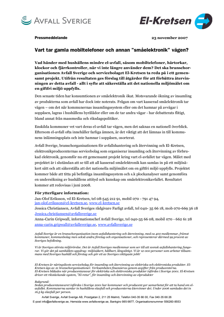 Branschorganisationen Avfall Sverige och servicebolaget El-Kretsen genomför nu ett gemensamt projekt kring vart det kasserade el-avfallet tar vägen. Om det når kommunernas insamlingssystem eller hamnar på avvägar i soppåsen, lagras i hushållens byrålådor eller om de tar andra vägar har debatterats flitigt, bland annat från massmedia och riksdagspolitiker.