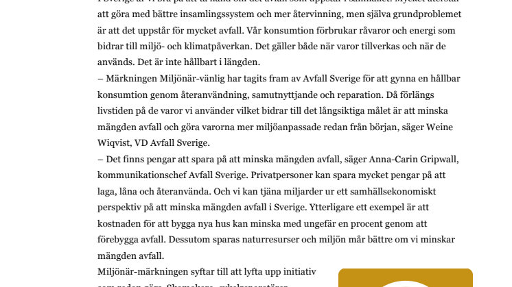 – Märkningen Miljönär-vänlig har tagits fram av Avfall Sverige för att gynna en hållbar konsumtion genom återanvändning, samutnyttjande och reparation. Då förlängs livstiden på de varor vi använder vilket bidrar till det långsiktiga målet är att minska mängden avfall och göra varorna mer miljöanpassade redan från början, säger Weine Wiqvist, VD Avfall Sverige.