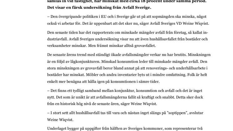 De senaste årens trend med ständigt ökade avfallsmängder verkar nu har brutits. Minskningen är en följd av lågkonjunkturen. Minskad konsumtion leder till minskade mängder avfall. Den stora minskningen av grovavfall beror bland annat på att renoverings- och underhållsarbete i bostäder har minskat. Möbler och andra inventarier byts ut i mindre omfattning. Folk är helt enkelt mer benägna att hålla igen på konsumtionen i sämre tider.