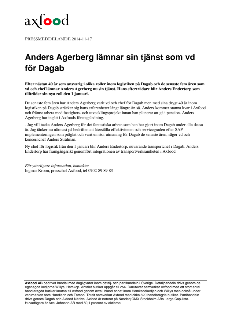 Efter nästan 40 år som ansvarig i olika roller inom logistiken på Dagab och de senaste fem åren som vd och chef lämnar Anders Agerberg nu sin tjänst. Hans efterträdare blir Anders Endertorp som tillträder sin nya roll den 1 januari.