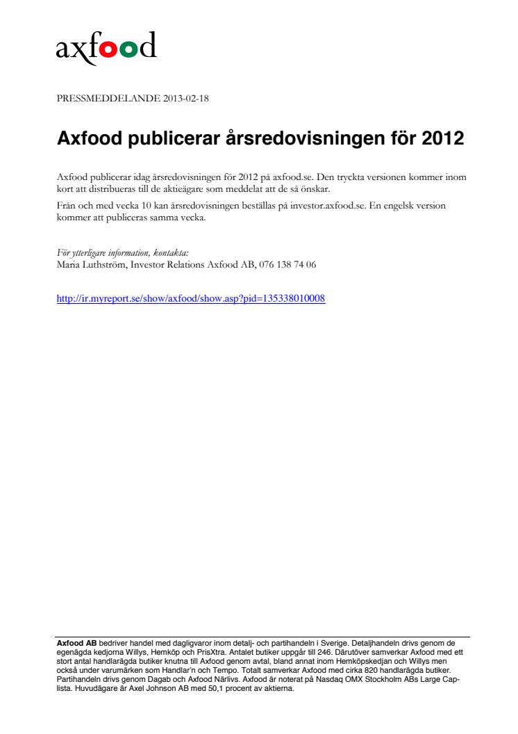 Axfood publicerar idag årsredovisningen för 2012 på axfood.se. Den tryckta versionen kommer inom kort att distribueras till de aktieägare som meddelat att de så önskar.