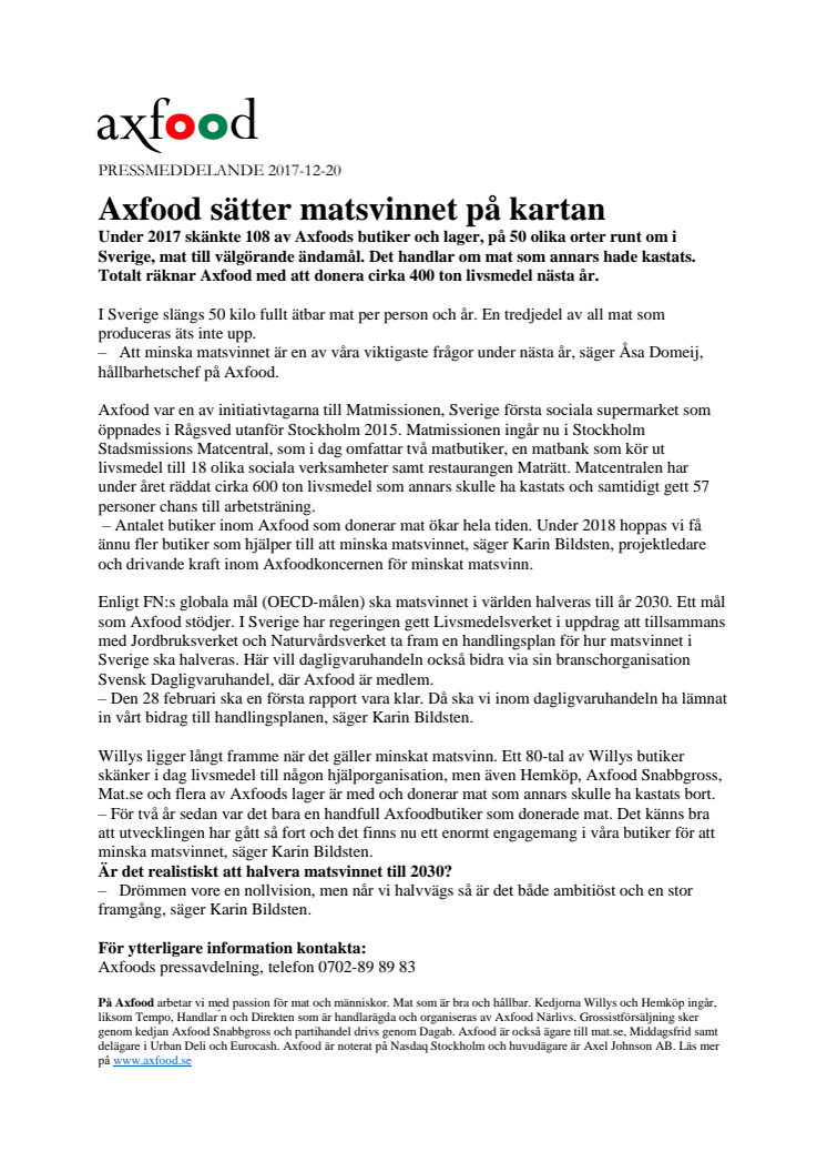 Under 2017 skänkte 108 av Axfoods butiker och lager, på 50 olika orter runt om i Sverige, mat till välgörande ändamål. Det handlar om mat som annars hade kastats. Totalt räknar Axfood med att donera cirka 400 ton livsmedel nästa år.