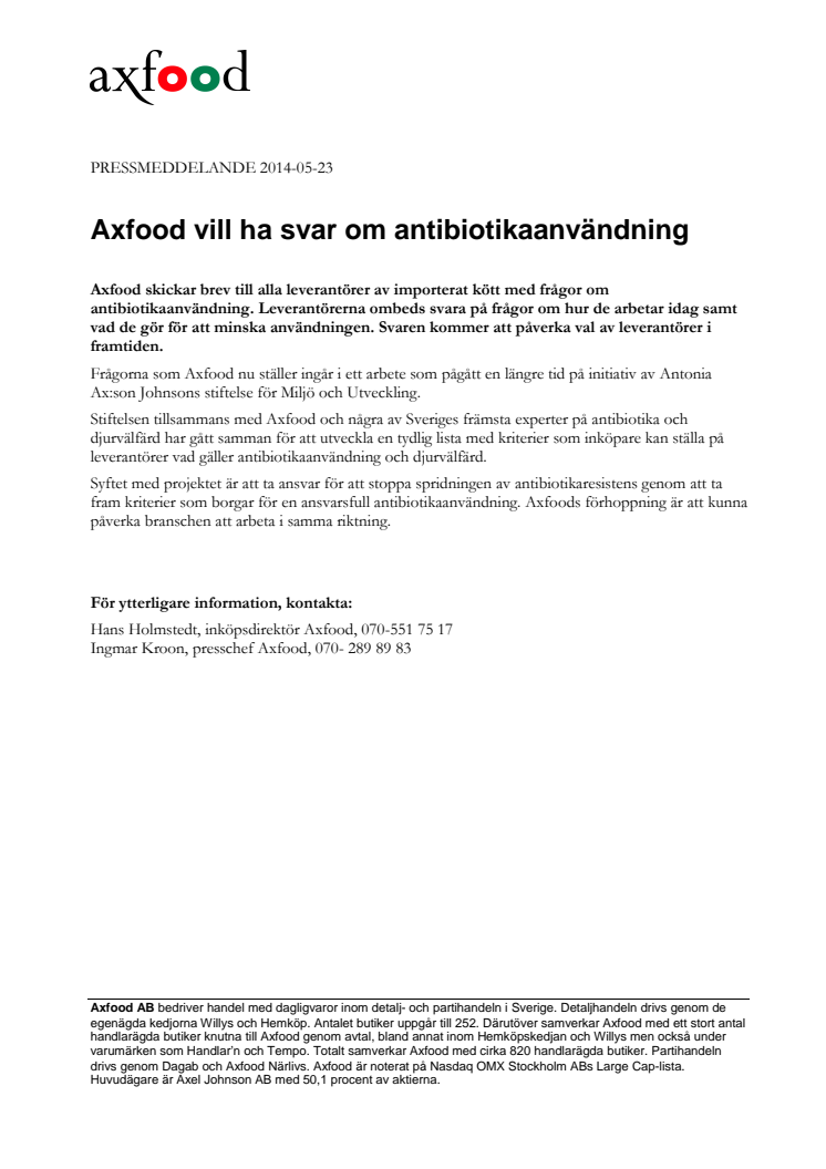 Axfood vill ha svar om antibiotikaanvändning
