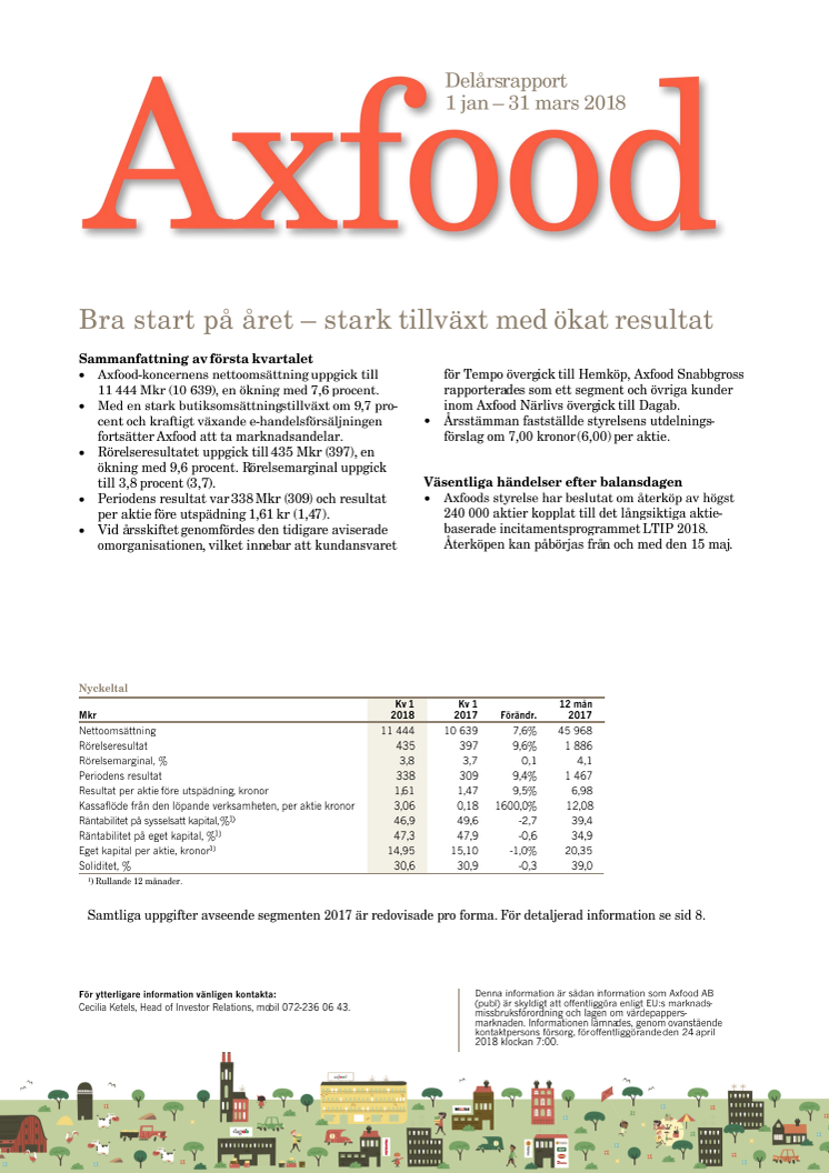 Axfoods första kvartal för 2018 visar på en riktigt bra start på året. Vi har en stark tillväxt med ökat resultat. Försäljningen i våra butiker är långt över den uppskattade marknadstillväxten, vilket visar att vi fortsätter ta marknadsandelar. Framför allt sålde Willys-butikerna bra under hela kvartalet och avslutade med en riktigt stark påskhandel.