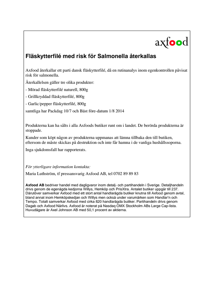 Axfood återkallar ett parti dansk fläskytterfilé, då en rutinanalys inom egenkontrollen påvisat risk för salmonella.