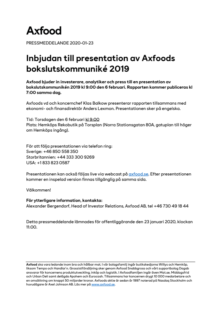 Axfood bjuder in investerare, analytiker och press till en presentation av bokslutskommunikén 2019 kl 9:00 den 6 februari. Rapporten kommer publiceras kl 7:00 samma dag.