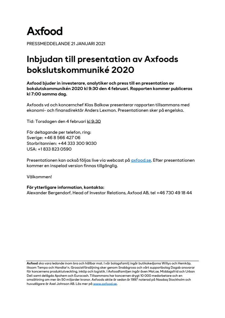 Inbjudan till presentation av Axfoods bokslutskommuniké 2020