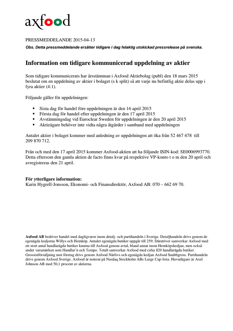 Som tidigare kommunicerats har årsstämman i Axfood Aktiebolag (publ) den 18 mars 2015 beslutat om en uppdelning av aktier i bolaget (s k split) så att varje nu befintlig aktie delas upp i fyra aktier (4:1).