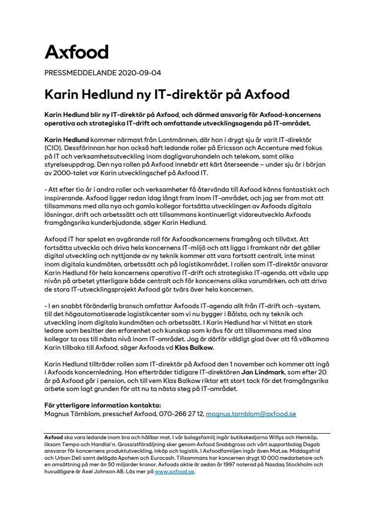 Karin Hedlund blir ny IT-direktör på Axfood, och därmed ansvarig för Axfood-koncernens operativa och strategiska IT-drift och omfattande utvecklingsagenda på IT-området.