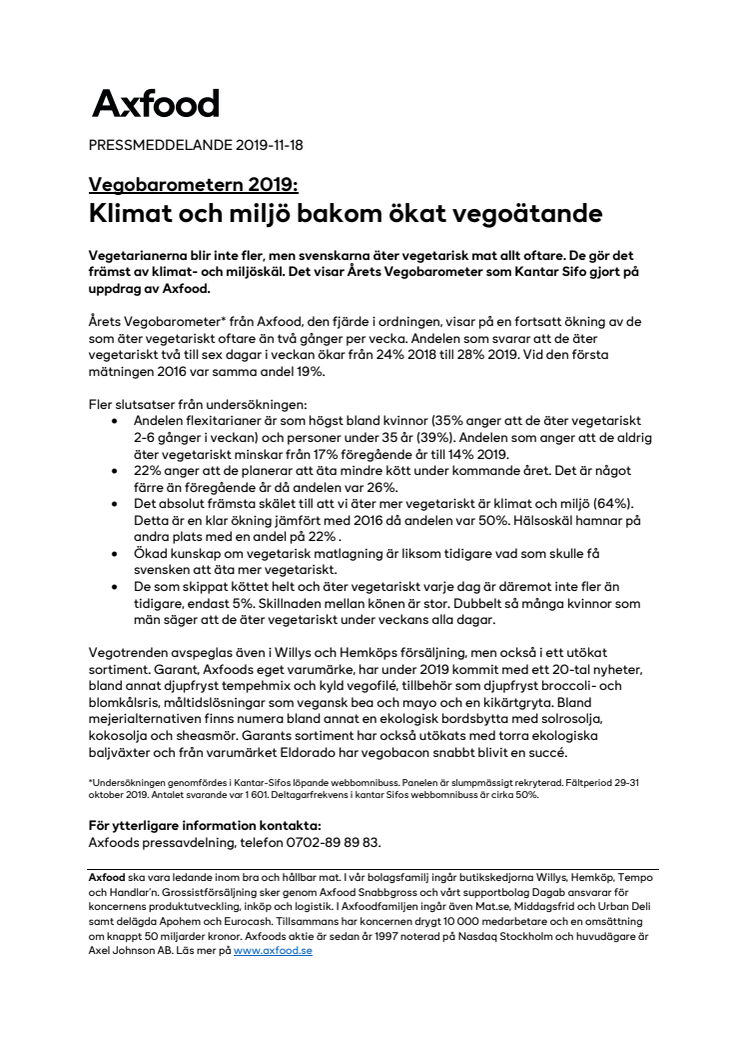 Vegetarianerna blir inte fler, men svenskarna äter vegetarisk mat allt oftare. De gör det främst av klimat- och miljöskäl. Det visar Årets Vegobarometer som Kantar Sifo gjort på uppdrag av Axfood.