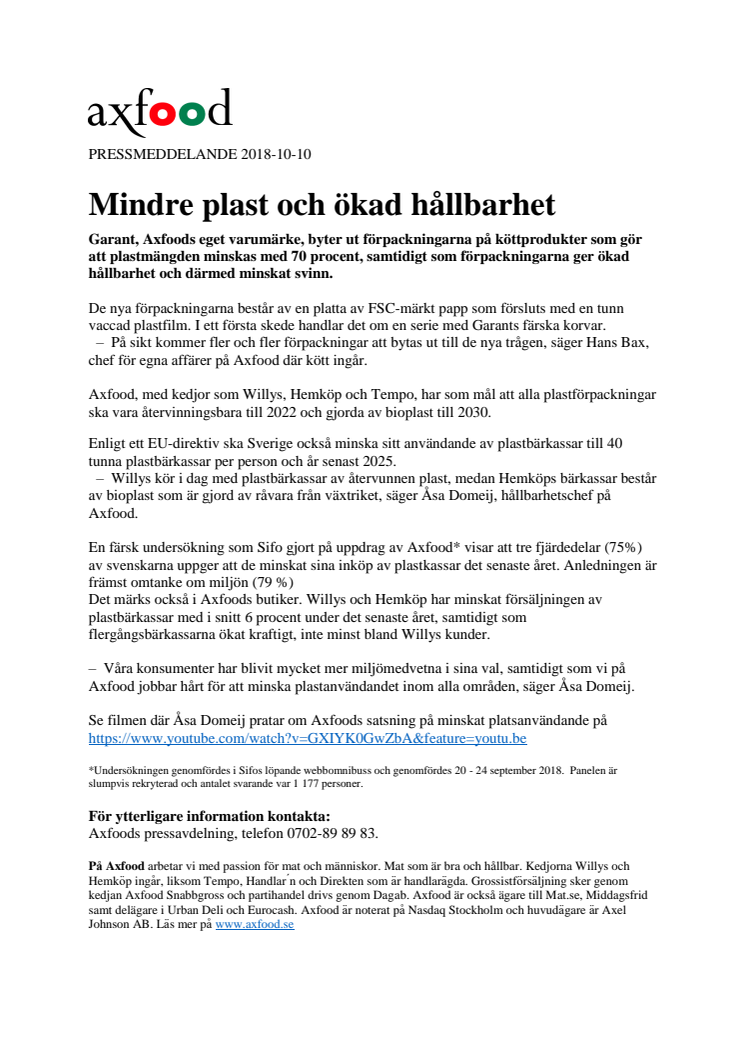 Garant, Axfoods eget varumärke, byter ut förpackningarna på köttprodukter som gör att plastmängden minskas med 70 procent, samtidigt som förpackningarna ger ökad hållbarhet och därmed minskat svinn.