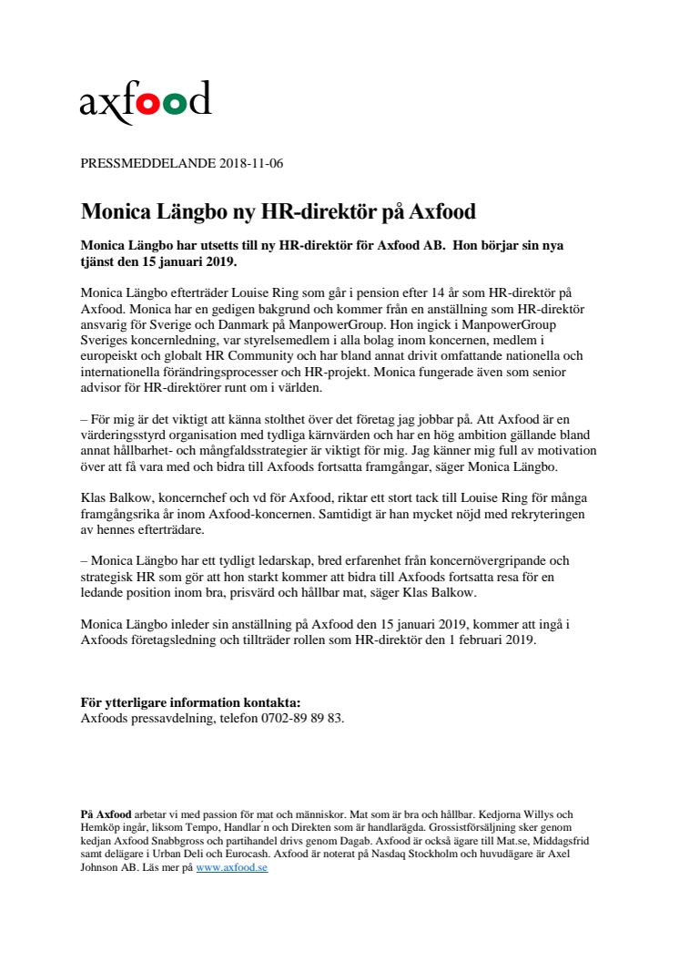 Monica Längbo har utsetts till ny HR-direktör för Axfood AB. Hon börjar sin nya tjänst den 15 januari 2019.