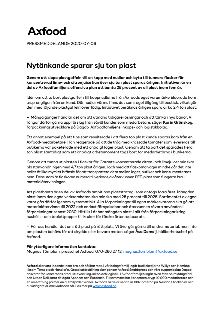 Genom att slopa plastgaffeln till en kopp med nudlar och byta till tunnare flaskor för koncentrerad lime- och citronjuice kan över sju ton plast sparas årligen. Initiativen är en del av Axfoodfamiljens offensiva plan att banta 25 procent av all plast inom fem år.
