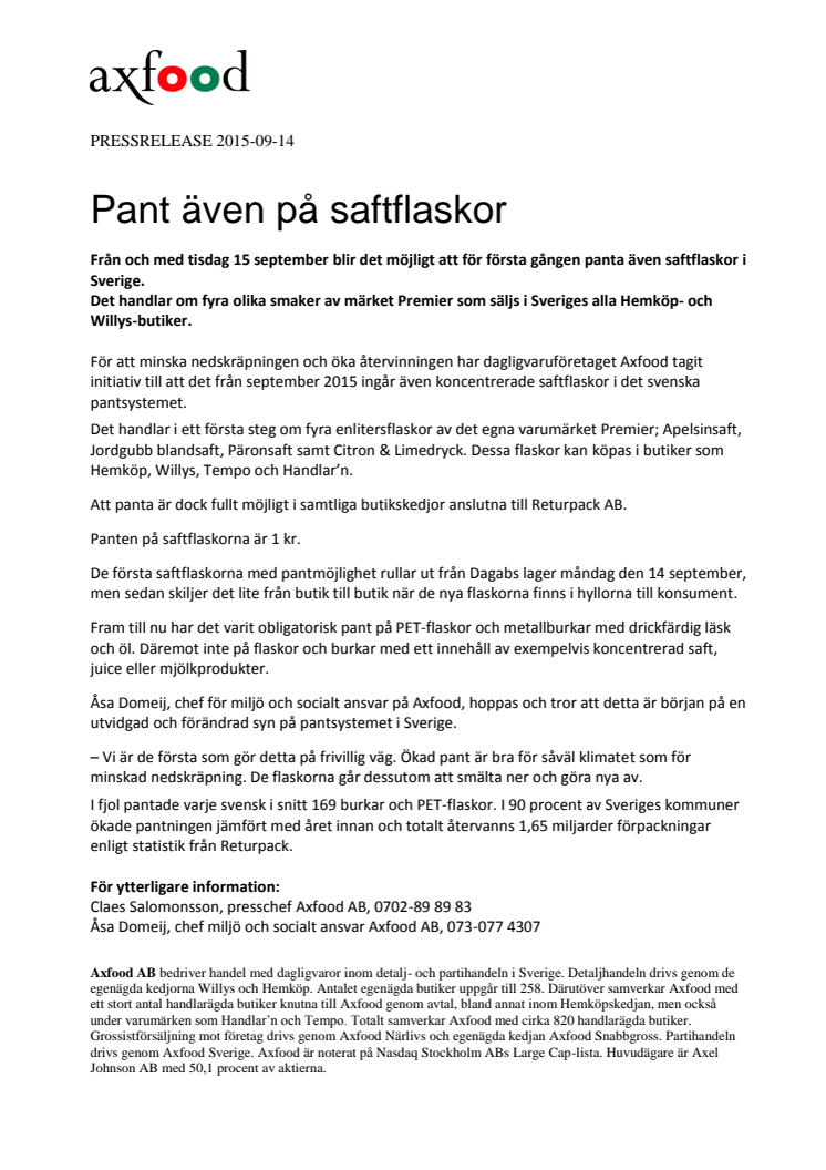 Från och med tisdag 15 september blir det möjligt att för första gången panta även saftflaskor i Sverige.