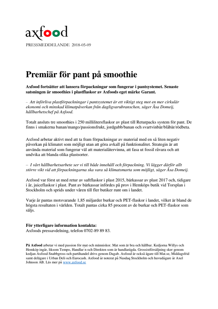 Axfood fortsätter att lansera förpackningar som fungerar i pantsystemet. Senaste satsningen är smoothies i plastflaskor av Axfoods eget märke Garant.