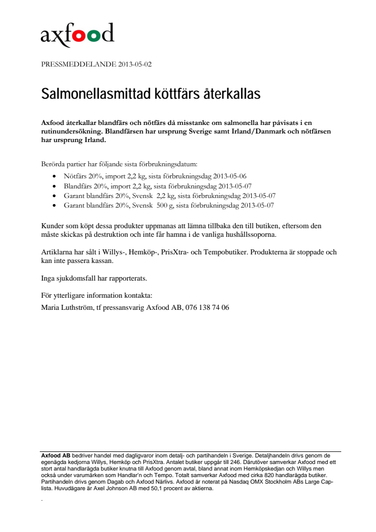 Axfood återkallar blandfärs och nötfärs då misstanke om salmonella har påvisats i en rutinundersökning. Blandfärsen har ursprung Sverige samt Irland/Danmark och nötfärsen har ursprung Irland.