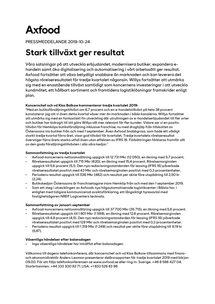 Våra satsningar på att utveckla erbjudandet, modernisera butiker, expandera e-handeln samt öka digitalisering och automatisering i vårt arbetssätt ger resultat. Axfood fortsätter att växa betydligt snabbare än marknaden och kan leverera det högsta rörelseresultatet för tredje kvartalet någonsin.