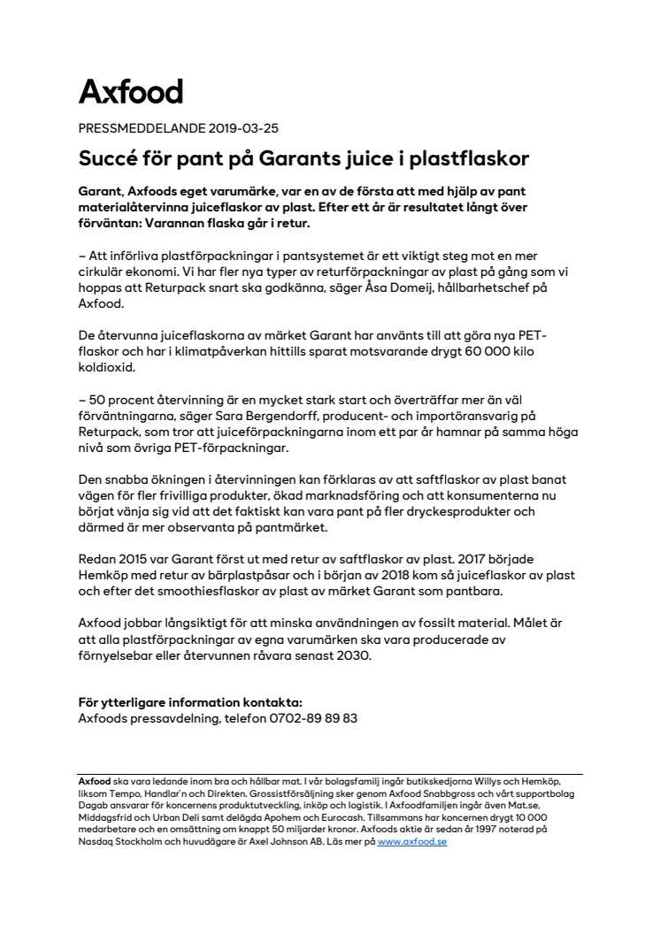 Garant, Axfoods eget varumärke, var en av de första att med hjälp av pant materialåtervinna juiceflaskor av plast. Efter ett år är resultatet långt över förväntan: Varannan flaska går i retur.
