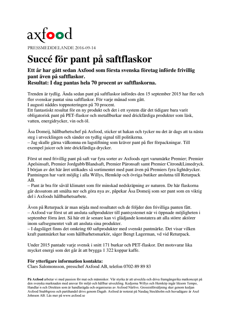 Ett år har gått sedan Axfood som första svenska företag införde frivillig pant även på saftflaskor.