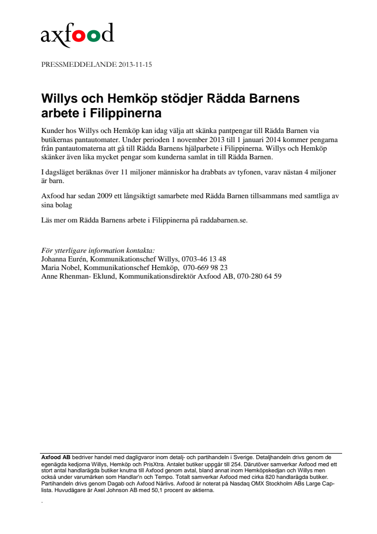 Kunder hos Willys och Hemköp kan idag välja att skänka pantpengar till Rädda Barnen via butikernas pantautomater. Under perioden 1 november 2013 till 1 januari 2014 kommer pengarna från pantautomaterna att gå till Rädda Barnens hjälparbete i Filippinerna. Willys och Hemköp skänker även lika mycket pengar som kunderna samlat in till Rädda Barnen.