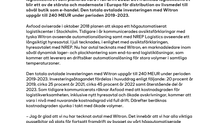 Axfood har enligt tidigare kommunicerad avsiktsförklaring tecknat avtal med Witron om att investera i bolagets teknologi för det högautomatiserade logistikcentret som planeras vara i full drift 2023. Det framtida logistikcentret blir ett av de största och modernaste i Europa för distribution av livsmedel till såväl butik som e-handel. Den totala avtalade investeringen med Witron uppgår till 240 MEUR under perioden 2019-2023.