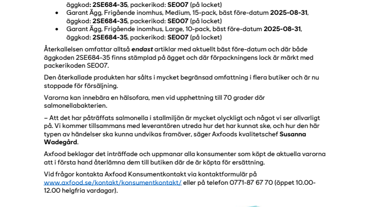 Efter att leverantören i en rutinkontroll upptäckt salmonella i stallmiljön återkallar Axfood av försiktighetsskäl ett fåtal äggartiklar från Garant, då det finns en risk att äggen kan innehålla salmonella.