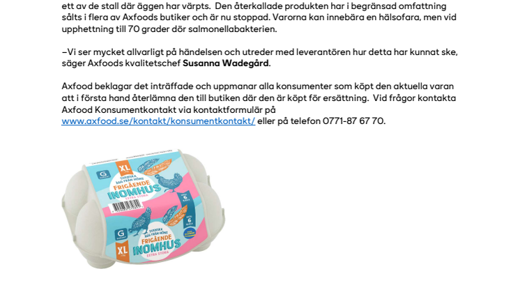 Återkallelsen gäller för Garant ägg, frigående inomhus XL, 6-pack, med bäst före datum 2023-01-26. Leverantören av äggen har vid en rutinkontroll upptäckt salmonella i stallmiljön i ett av de stall där äggen har värpts. Den återkallade produkten har i begränsad omfattning sålts i flera av Axfoods butiker och är nu stoppad. Varorna kan innebära en hälsofara, men vid upphettning till 70 grader dör salmonellabakterien.