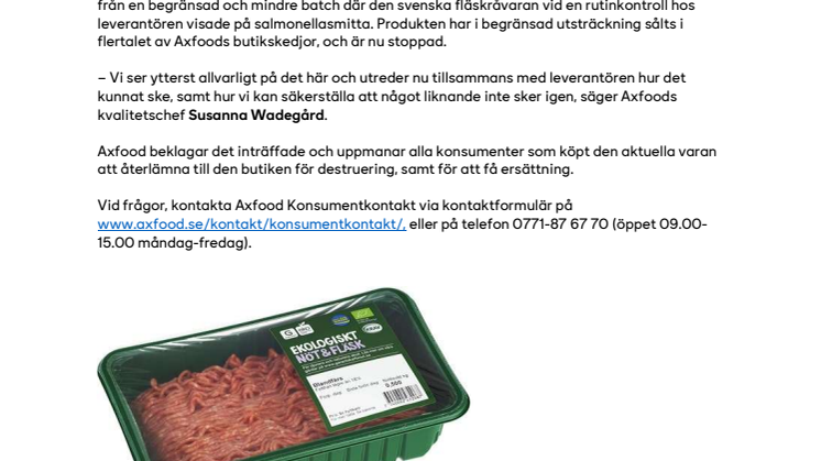 Axfood återkallar Garant Ekologiskt nöt & fläsk (blandfärs) 18%, 500 gram, sedan det visat sig att en begränsad batch av produkten innehåller salmonella.