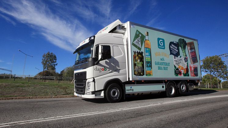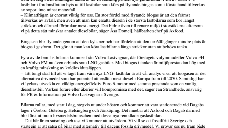 Som första livsmedelsföretag sätter Axfood i dagarna ut fem nya fossilfria lastbilar i trafik från Dagab, som levererar mat till bland annat Willys, Hemköp och Tempos butiker. Lastbilarna körs på flytande biogas.