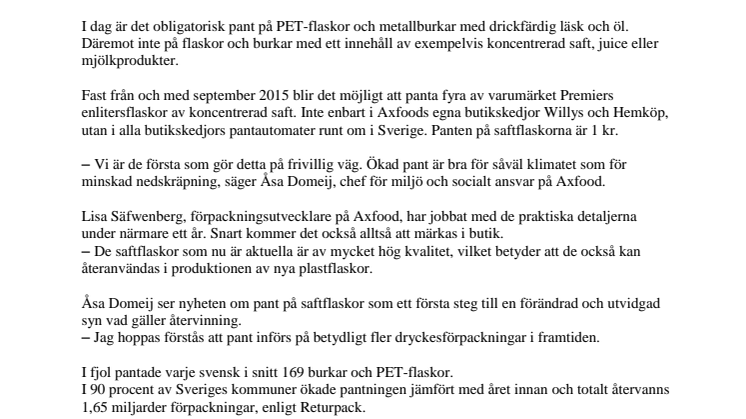 Axfood blir först i Sverige med att införa pant på saftflaskor. Det handlar i ett första steg om fyra saftflaskor av det egna varumärket Premier; Apelsinsaft, Jordgubb blandsaft, Päronsaft samt Citron & Limedryck.