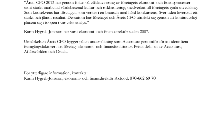 Utmärkelsen Årets CFO bygger på en undersökning som Accenture genomför för att identifiera framgångsfaktorer hos företags ekonomi- och finansfunktioner. Priset delas ut av Accenture, Affärsvärlden och Oracle.