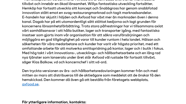 - I en exceptionell tid summerar Axfood ett år som både överträffar marknadens tillväxt och innebär en ökad lönsamhet. Willys fantastiska utveckling fortsätter, Hemköp har fortsatt utveckla sitt koncept och Snabbgross har genom snabbfotad innovation stått emot en svag restaurangmarknad och tagit marknadsandelar. E-handeln har skjutit i höjden och Axfood har växt mer än marknaden även i denna kanal. Dagab har på ett utomordentligt sätt stöttat kedjorna och lagt grunden för koncernens lönsamhetsförbättring. Trots stora påfrestningar har vi tillsammans axlat vårt samhällsansvar i att hålla butiker, lager och transporter igång, med fantastiska insatser som gjorts inom vår organisation för att säkra varuförsörjningen och möjliggöra en god tillgänglighet på varor till kunder runtom i hela landet. Hälsan och säkerheten för våra medarbetare och kunder har varit vår högsta prioritet, med ett omfattande arbete för att motverka smittspridning på kontor, lager och i butik i fokus. Med hög takt i vårt innovations-, utvecklings- och hållbarhetsarbete och en lång rad nya tjänster som lanserats under året står Axfood väl rustade för fortsatt tillväxt, säger Klas Balkow, vd och koncernchef i sitt vd-ord.