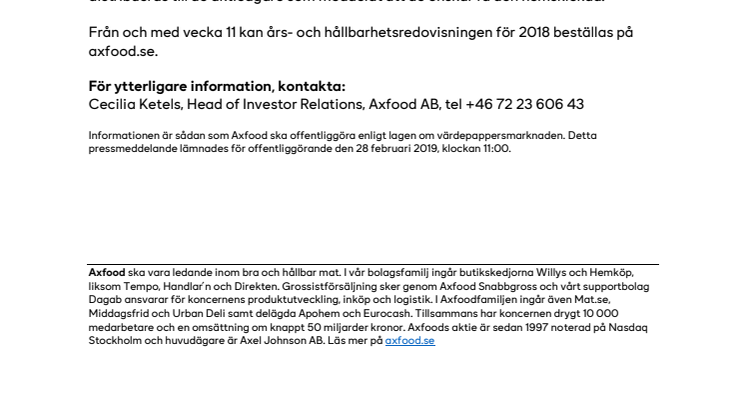 Axfood publicerar idag års- och hållbarhetsredovisning 2018 på axfood.se. Den tryckta versionen av års- och hållbarhetsredovisningen kommer inom kort att distribueras till de aktieägare som meddelat att de önskar få den hemskickad.