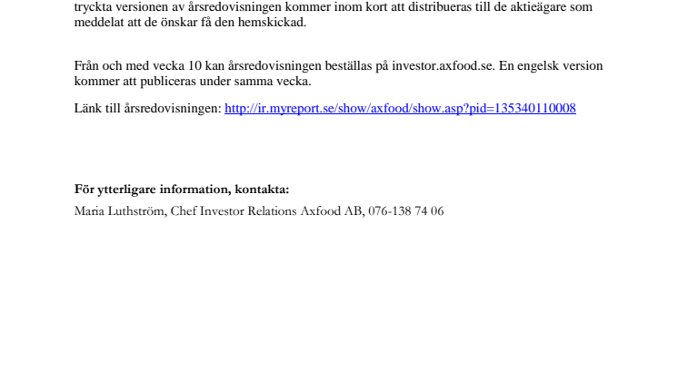 Från och med vecka 10 kan årsredovisningen beställas på investor.axfood.se. En engelsk version kommer att publiceras under samma vecka.