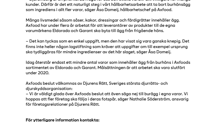 Axfoods konsumentbutiker säljer sedan tidigare inga ägg från burhöns. Ett arbete pågår även för att minska förekomsten av ägg från burhöns i hundratals så kallade sammansatta produkter. Målet är att inga produkter av de egna varumärkena Eldorado och Garant ska innehålla burhönsägg redan under nästa år.
