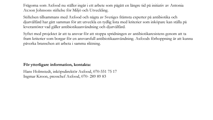 Axfood skickar brev till alla leverantörer av importerat kött med frågor om antibiotikaanvändning. Leverantörerna ombeds svara på frågor om hur de arbetar idag samt vad de gör för att minska användningen. Svaren kommer att påverka val av leverantörer i framtiden.