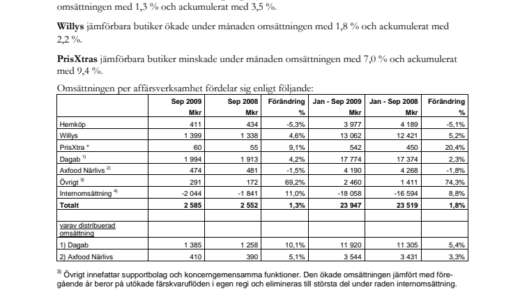 Under perioden januari - september 2009 ökade omsättningen för de egenägda butikerna med 3,0 % varav jämförbara butiker ökade med 1,0 %. Axfoods butiker (egenägda och Hemköp franchise) ökade med 2,6 % varav jäm¬förbara butiker ökade med 0,9 %.
