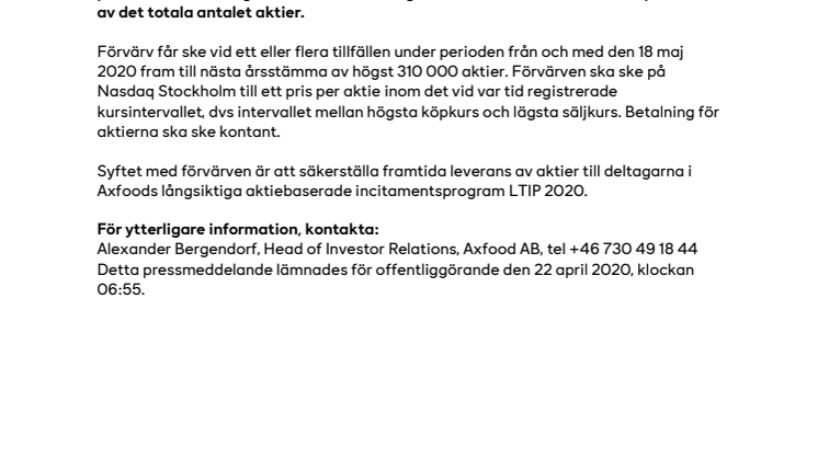 Axfoods styrelse har beslutat att utnyttja bemyndigandet från årsstämman den 18 mars 2020 avseende förvärv av egna aktier. Vid tidpunkten för detta pressmeddelande äger Axfood 572 000 egna aktier, vilket motsvarar 0,3 procent av det totala antalet aktier.