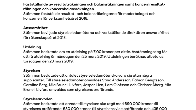 Stämman beslutade om en utdelning på 7,00 kronor per aktie. Avstämningsdag för att få utdelning är måndagen den 25 mars 2019. Utdelningen beräknas utbetalas torsdagen den 28 mars 2019.