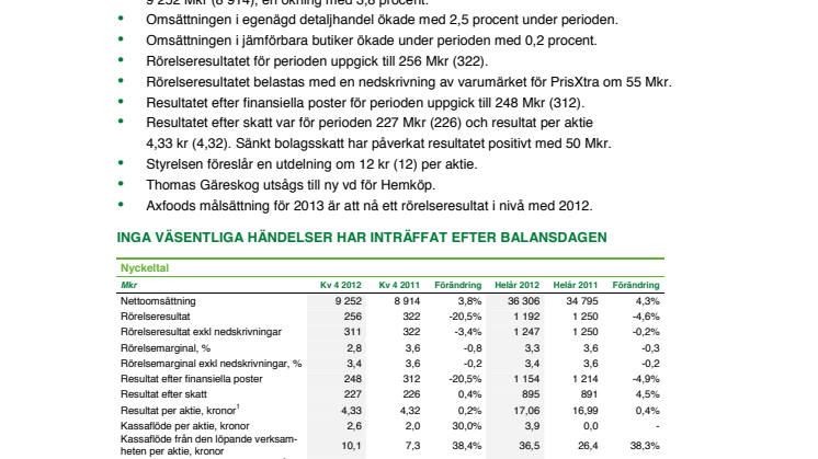 Bokslutskommuniké Axfood AB 1 jan - 31 dec 2012