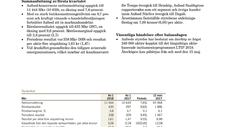 Denna information är sådan information som Axfood Aktiebolag (publ) är skyldigt att offentliggöra enligt EU:s marknadsmissbruksförordning och lagen om värdepappersmarknaden. Informationen lämnades, genom ovanstående kontaktpersons försorg, för offentliggörande den 24 april 2018 klockan 7:00 CET.