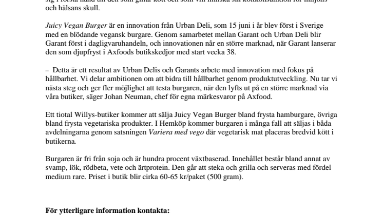 – Detta är ett resultat av Urban Delis och Garants arbete med innovation med fokus på hållbarhet. Vi delar ambitionen om att bidra till hållbarhet genom produktutveckling. Nu tar vi nästa steg och ger fler möjlighet att testa burgaren, när den lyfts ut på en större marknad via våra butiker, säger Johan Neuman, chef för egna märkesvaror på Axfood.