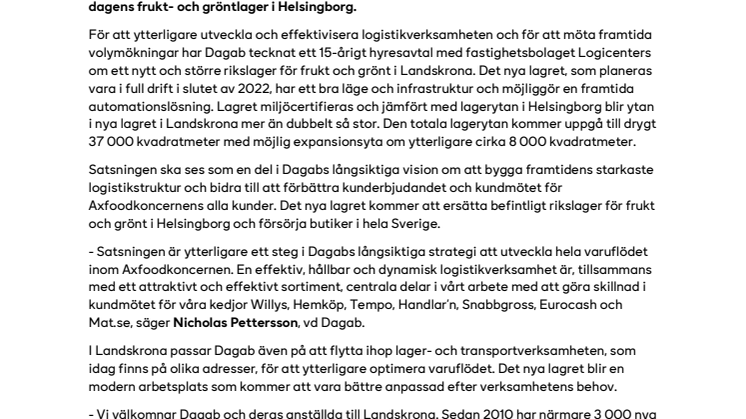 Axfoodkoncernens inköps- och logistikbolag Dagab har tecknat ett långsiktigt hyresavtal med fastighetsbolaget NREP Logicenters om ett helt nytt rikslager för frukt och grönt. Det nya lagret förläggs i Landskrona, skapar förutsättningar för högre effektivitet och ersätter dagens frukt- och gröntlager i Helsingborg.
