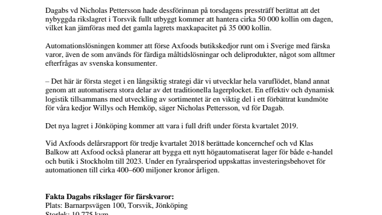 Dagabs vd Nicholas Pettersson hade dessförinnan på torsdagens pressträff berättat att det nybyggda rikslagret i Torsvik fullt utbyggt kommer att hantera cirka 50 000 kollin om dagen, vilket kan jämföras med det gamla lagrets maxkapacitet på 35 000 kollin.